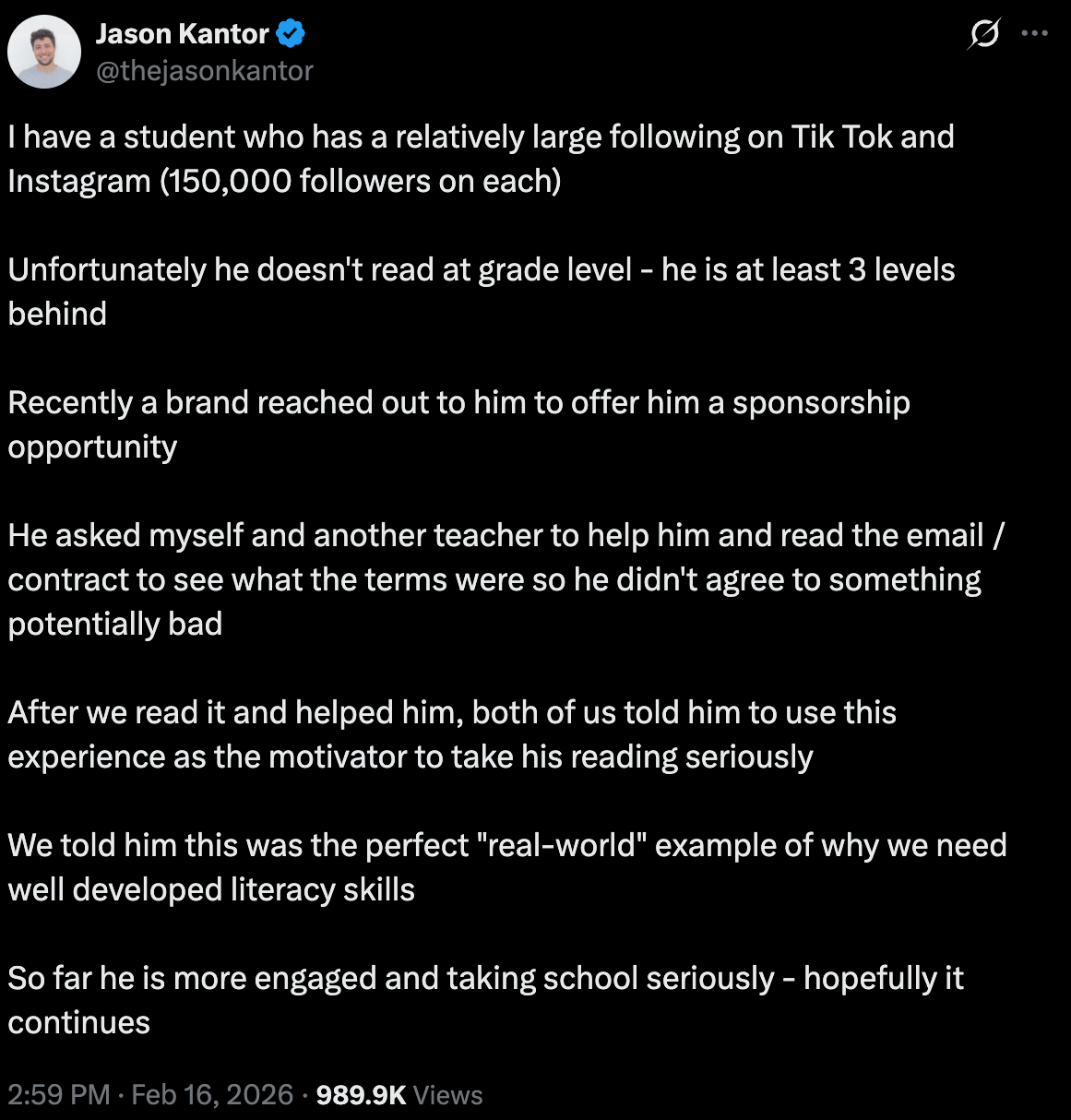 One of his students has 150,000 followers on TikTok and another 150,000 on Instagram. The student is also reading 3 grade levels behind.